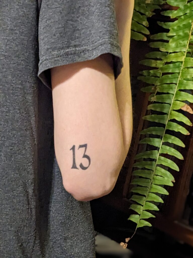 - I like that I was able to draw up my own design and Ping brought it to life perfectly. The number 13 has always been lucky in my family, so I’m glad to have that represented on my body.