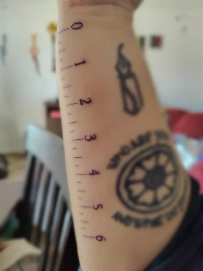 - It’s hard for me to pick an absolute favorite tattoo, but this one is definitely my favorite while I’m on the job. I love having a tattoo that’s functional, and it also puts a smile on other people’s faces or makes them laugh. I get questions about what it means or what it’s for, and I like getting to say that it’s genuinely just a ruler, with no deeper meaning.