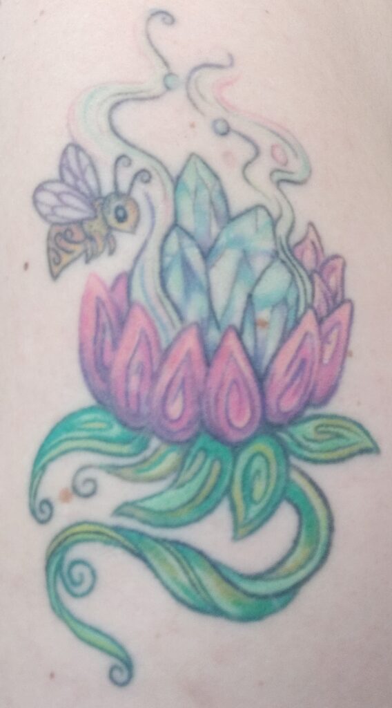 It’s okay to admit it: when you think of a librarian, you think of an older woman in a cardigan, a bun, and glasses with one of those long beaded strings connecting the arms. Here at DeKalb Public Library, we are lucky to have all kinds of library workers who break those stereotypes (and some who go right along with them)! It is important to us that all people feel welcome and represented when they enter the library; that’s why, this month, we are excited to share some of the coolest tattoos that decorate our library staff! Below, you’ll find pictures of staff tattoos as well as interviews about their tattoo experiences, meanings, media recommendations, and tips for those who are interested in being tattooed for the first time.