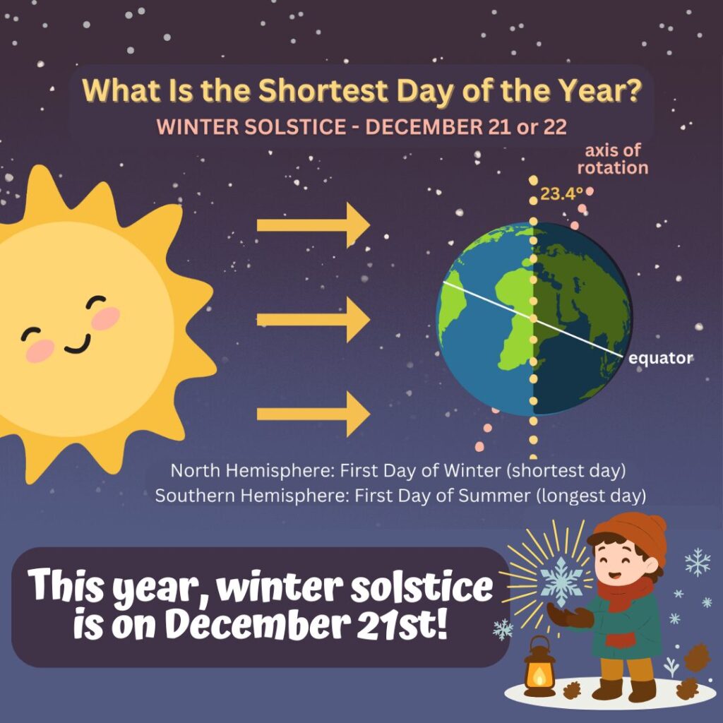 The Winter Solstice is the shortest day and longest night of the year, marking the astronomical start of winter in the Northern Hemisphere, which this year falls on December 21st. On this day the Earth’s axis is tilted farthest from the sun, resulting in the least direct sunlight. After this point, our days begin to lengthen as the Earth moves in its orbit.